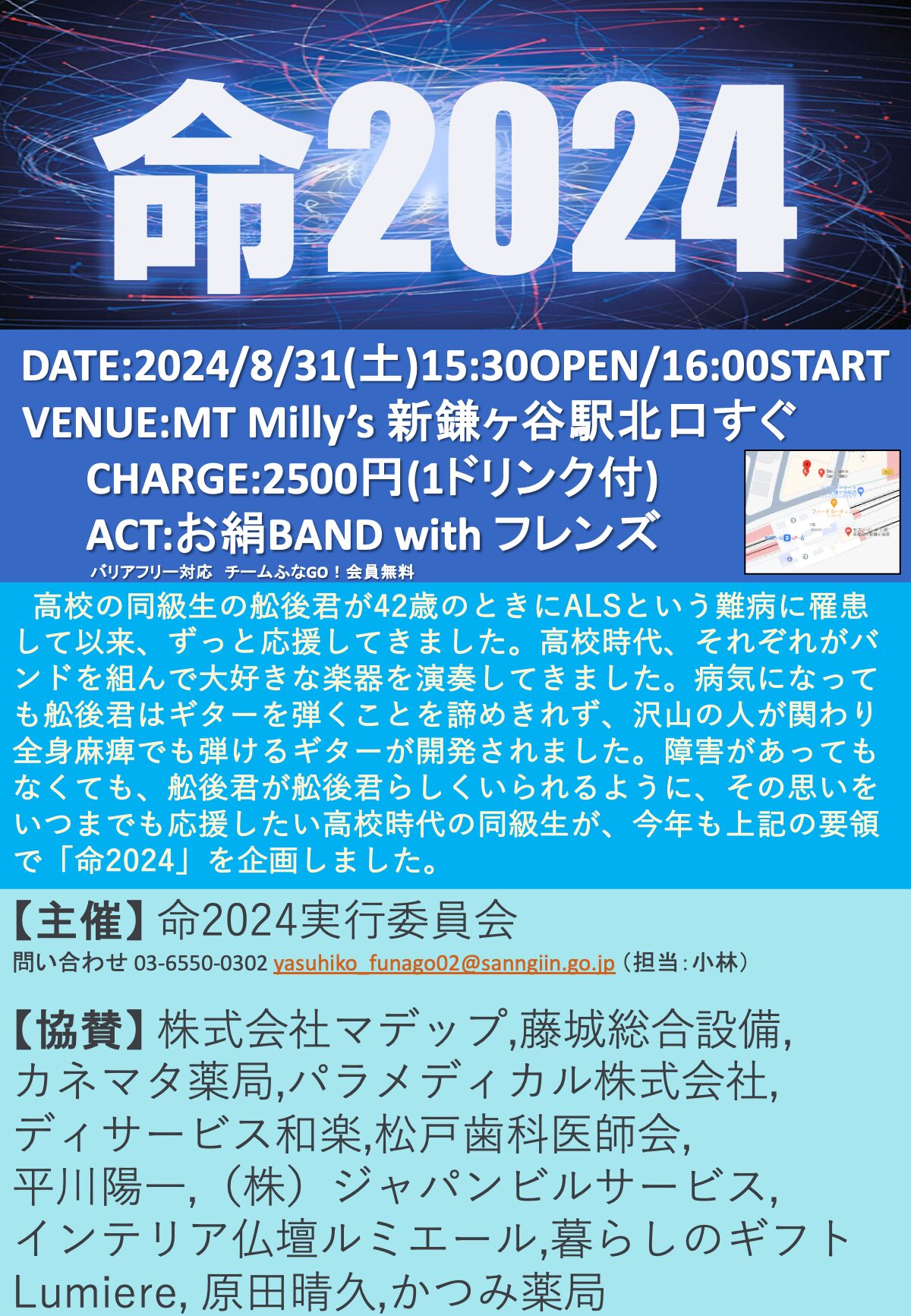 2024年8月31日、舩後靖彦が出演するライブイベント「命 2024」が開催されます。