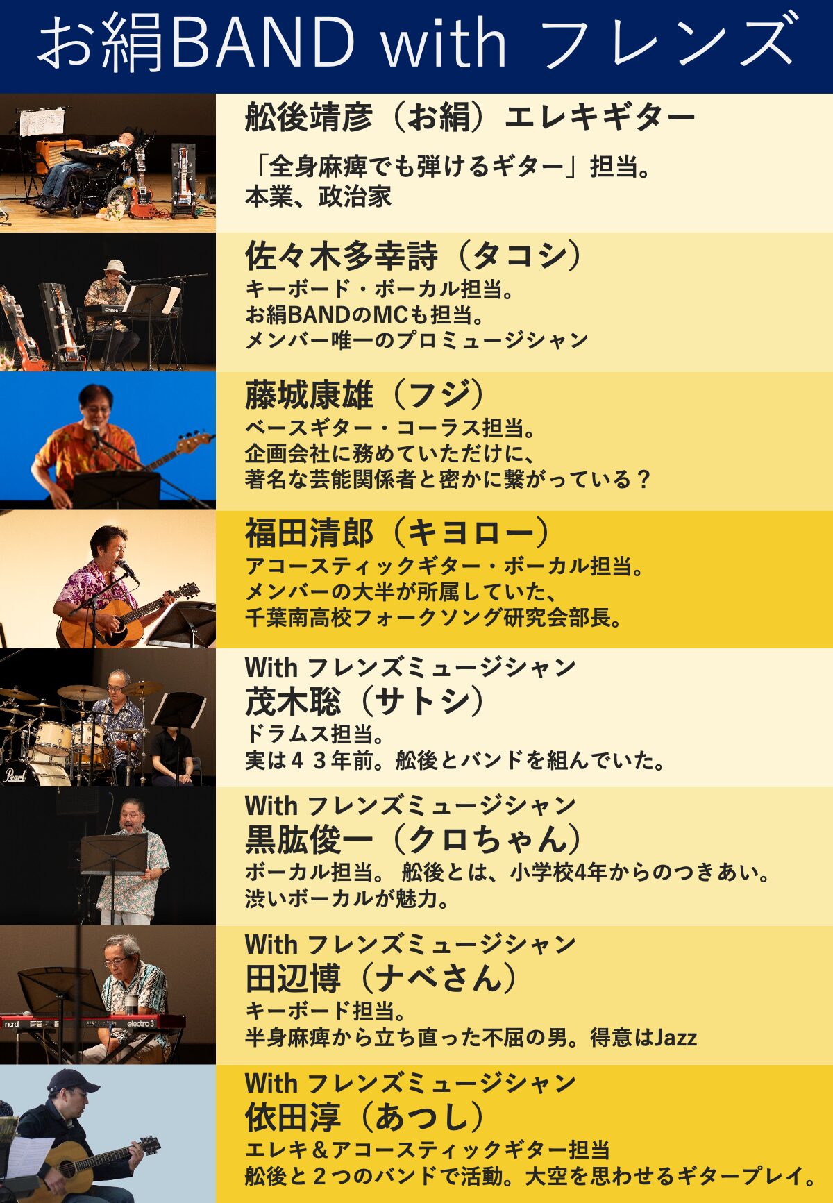 舩後が同級生や友人とともに組むバンド「お絹BAND wtih フレンズ」として、オリジナル曲などを披露します。