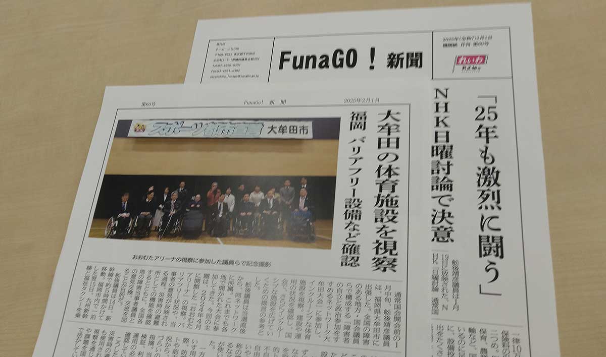 後援会機関紙60号(2025年2月号)を発行しました 2025年2月5日 最終更新日時 : 2025年10月6日 kojio550 舩後靖彦の後援会機関紙「Funa GO!新聞」第60号(2025年2月号)を発行し、会員の皆様に発送いたしました。FacebookXBlueskyCopy